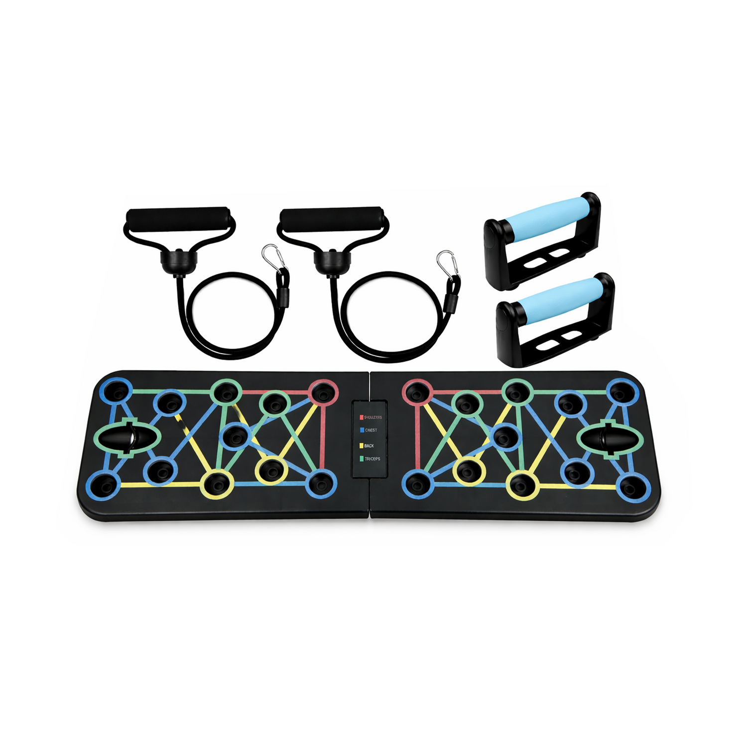 Das Liegestützbrett Pro ist die neue und verbesserte Version des Liegestützbrett Lite und erweitert dein Training durch zusätzliche Widerstandsbänder. Es baut auf dem gleichen bewährten Trainingsprinzip auf und ergänzt es mit weiteren einfachen und sinnvollen Möglichkeiten für ein noch besseres Home-Workout. Neben klassischen Liegestützen ermöglichen die Widerstandsbänder dir zusätzliche Übungen, mit denen du dein Training kontrolliert und gezielt abwechslungsreicher gestalten kannst, ohne komplizierte Geräte zu benötigen.